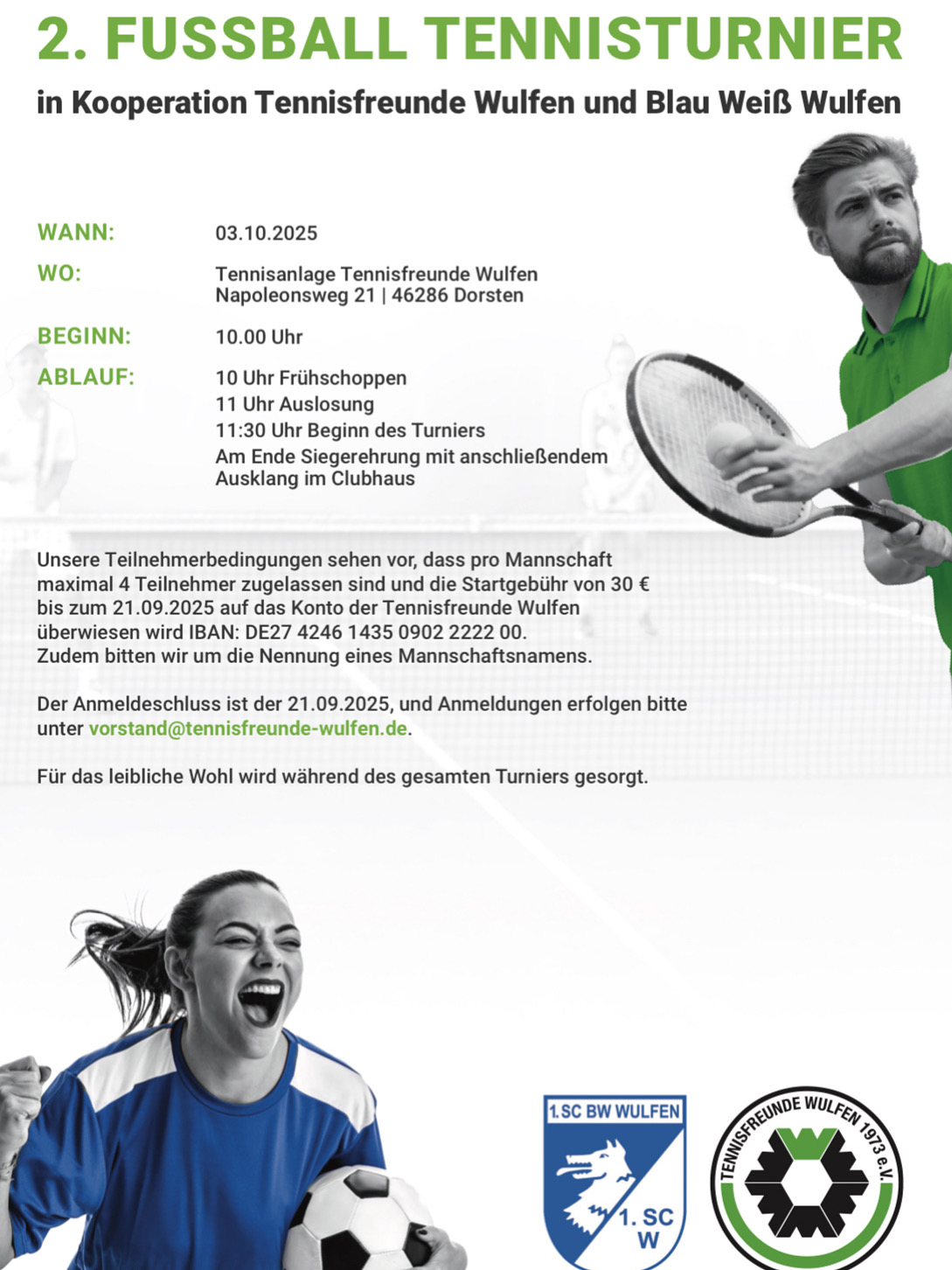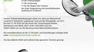 Am 03.10.2025 ist es wieder soweit: Das 2. Fußball-Tennisturnier der Tennisfreunde Wulfen in Kooperation mit Blau Weiß Wulfen steht an. Gespielt wird auf der Tennisanlage am Napoleonsweg 21 in ...