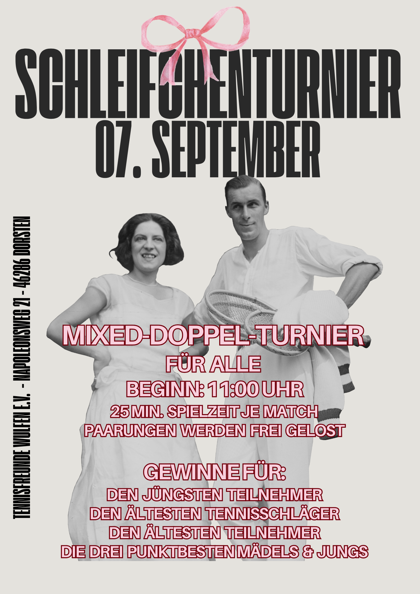 Liebe Tennisfreunde, es ist soweit – am Sonntag, den 07. September 2025, laden wir euch herzlich zu unserem diesjährigen Schleifchenturnier auf unserer Anlage ein! Ob ihr den Filzball mit Topspin ...