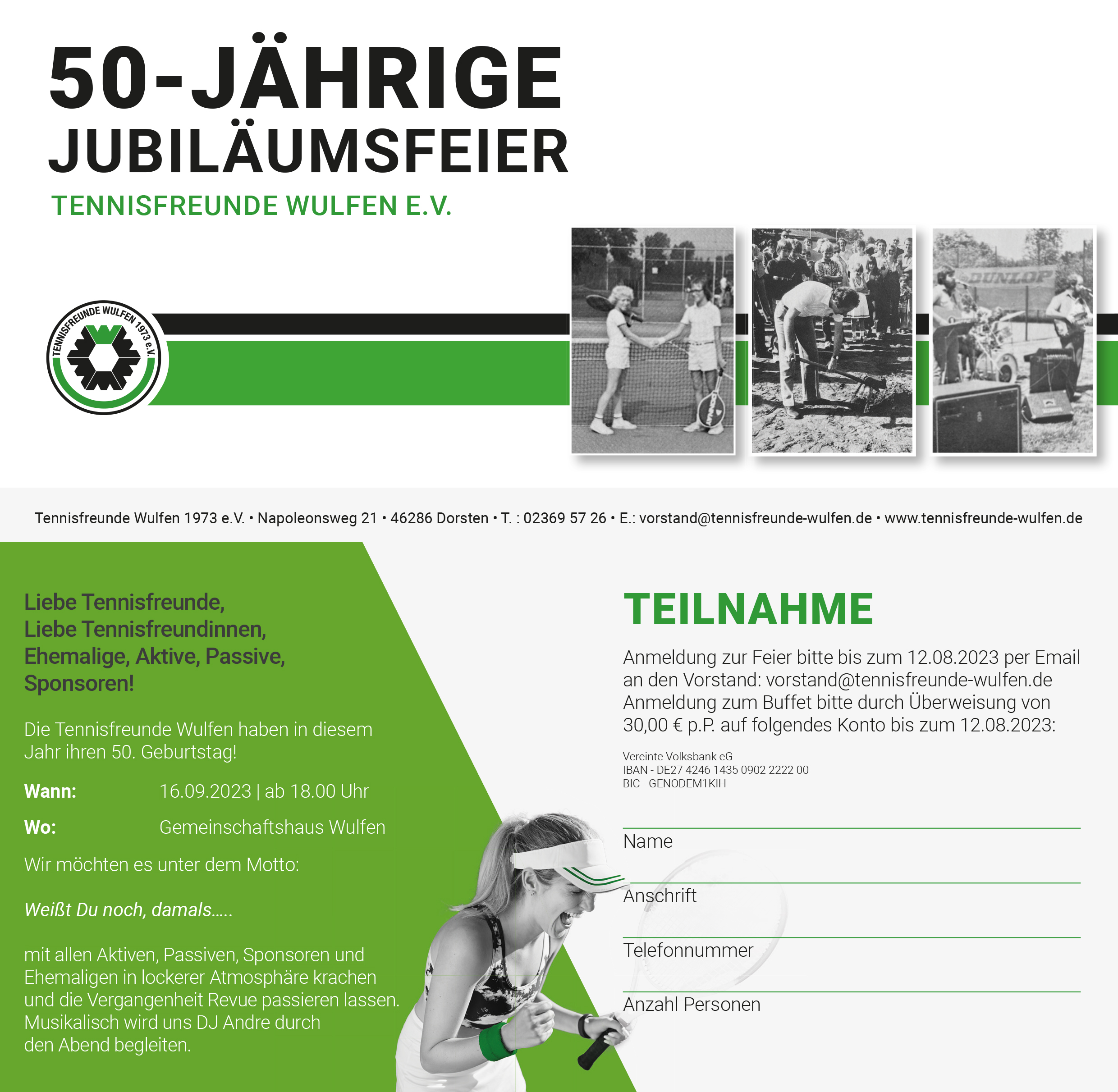 Liebe Tennisfreunde, Liebe Tennisfreundinnen, Ehemalige, Aktive, Passive, Sponsoren! Die Tennisfreunde Wulfen haben in diesem Jahr ihren 50. Geburtstag! Wir möchten es unter dem Motto: Weißt Du noch, damals….. mit allen Aktiven, Passiven, Sponsoren und Ehemaligen in lockerer Atmosphäre krachen und die Vergangenheit Revue passieren lassen. Musikalisch wird uns DJ Andre durch den Abend begleiten. Wann: 16.09.2023